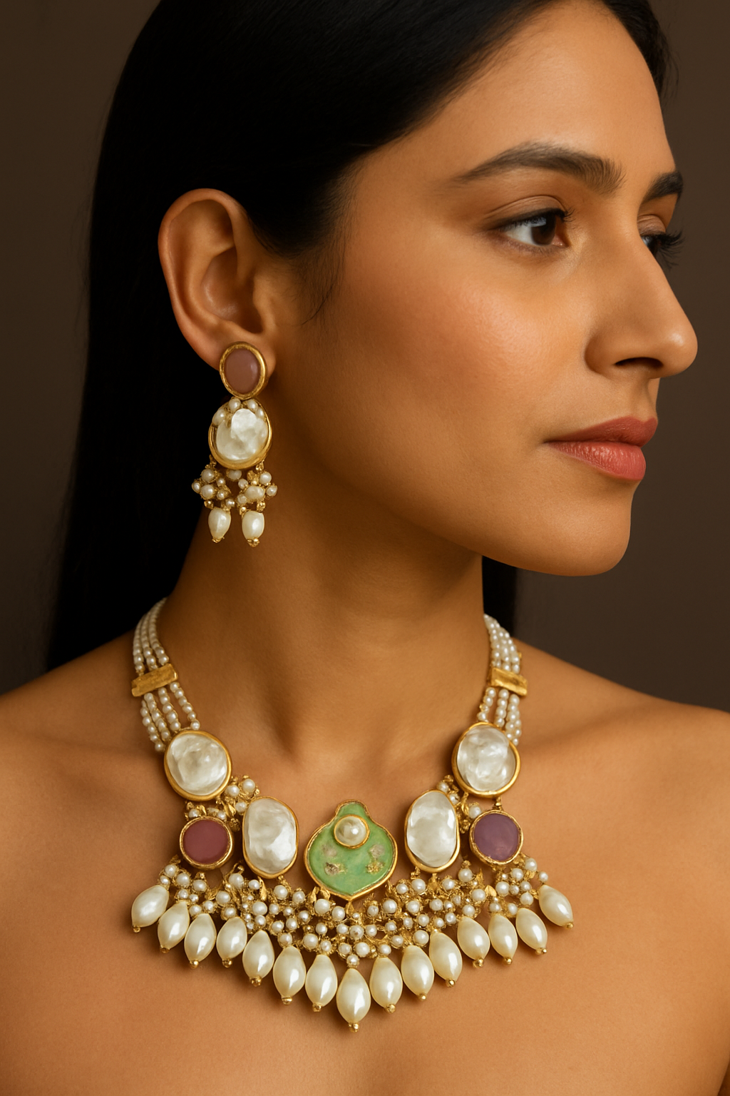 Dainty fusion choker in silver plated brass with handpainted pendant kundan work and clustered with pearls and has earring set which is a conversation starter and a showstopper