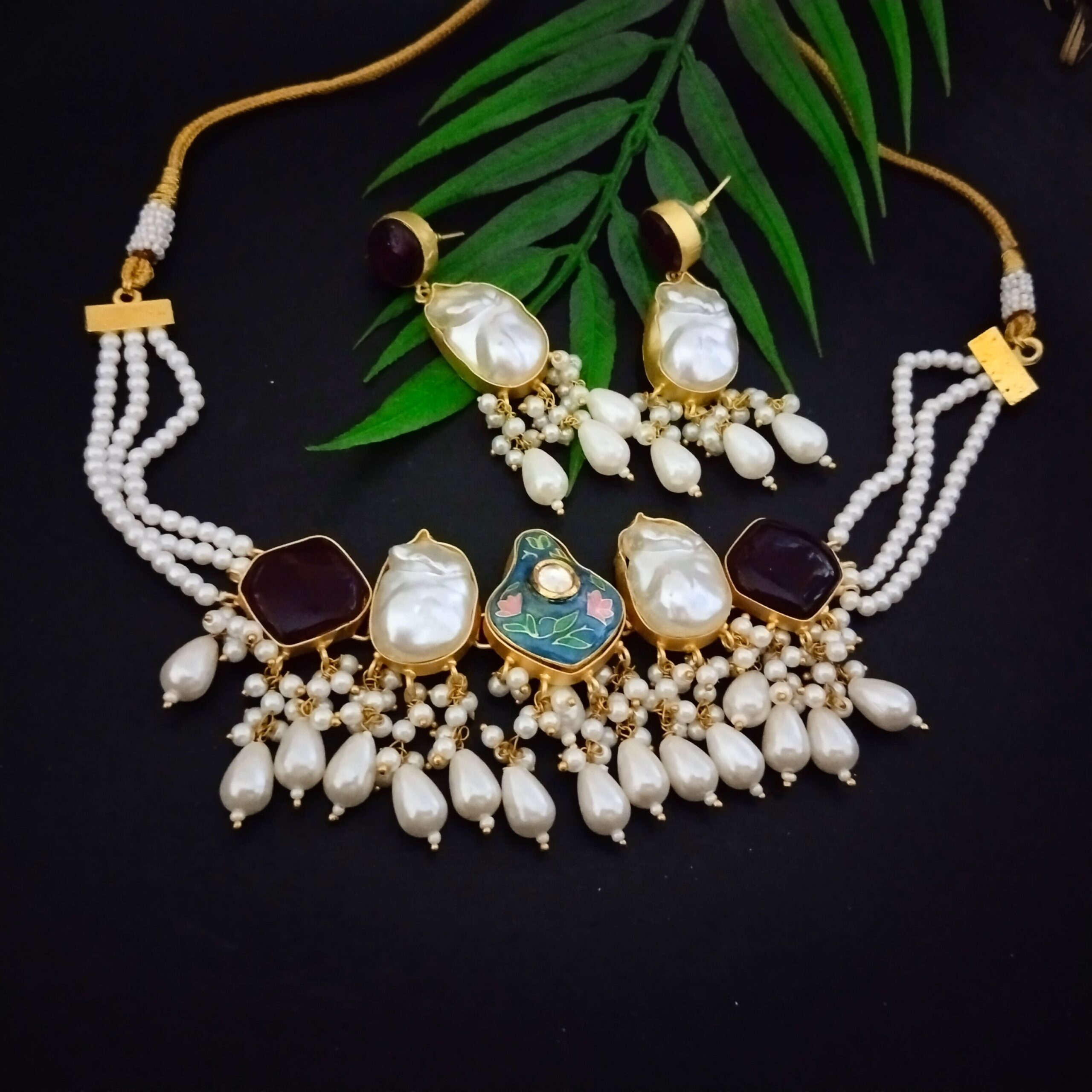 Dainty fusion choker in silver plated brass with handpainted pendant kundan work and clustered with pearls and has earring set which is a conversation starter and a showstopper