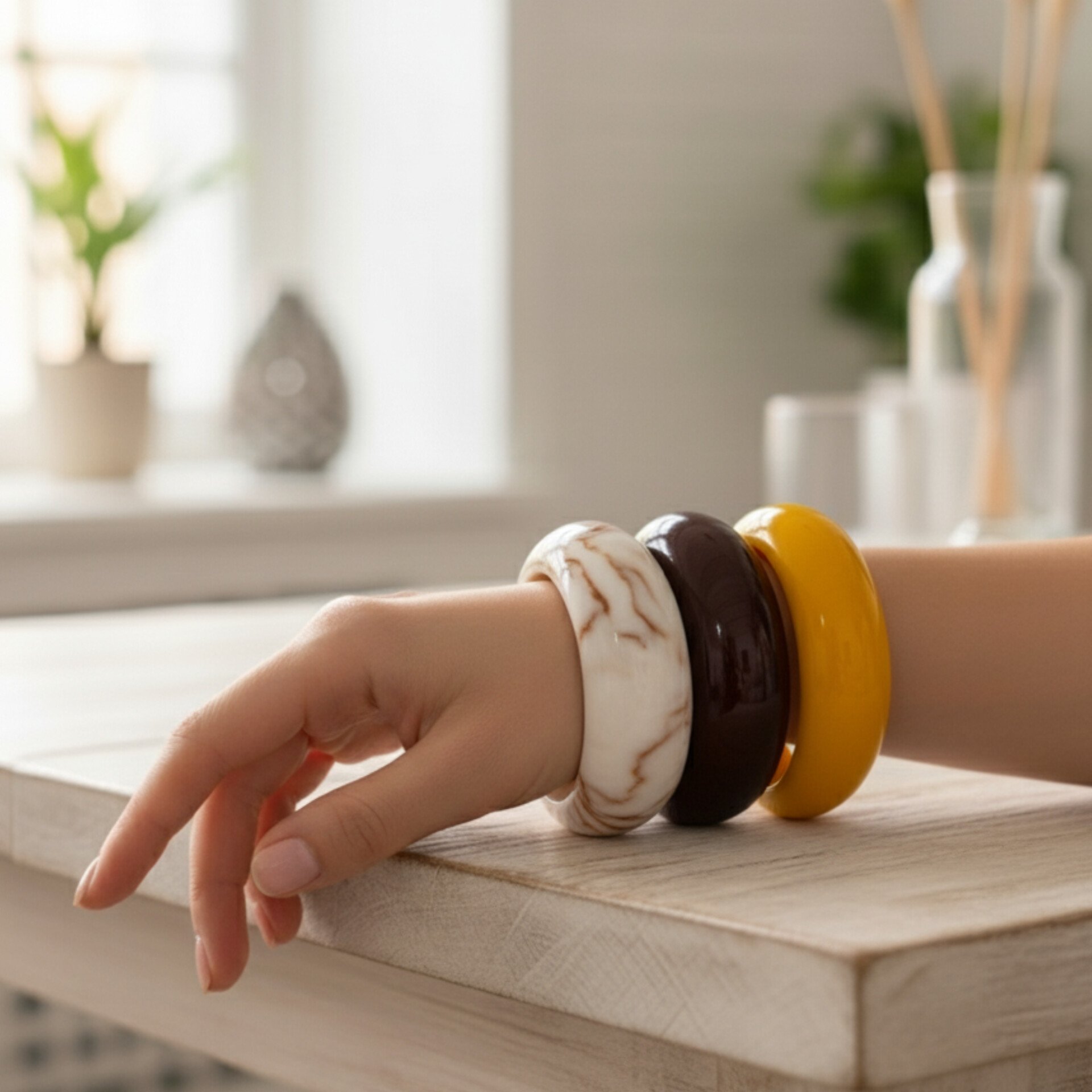 A vibrant handcrafted resin bangles in striking stacked colourful bangles . Featuring a glossy finish and a bold, this adds a playful pop of color to any outfit. Wear them stacked for a statement look or style them individually for a touch of elegance with a twist.