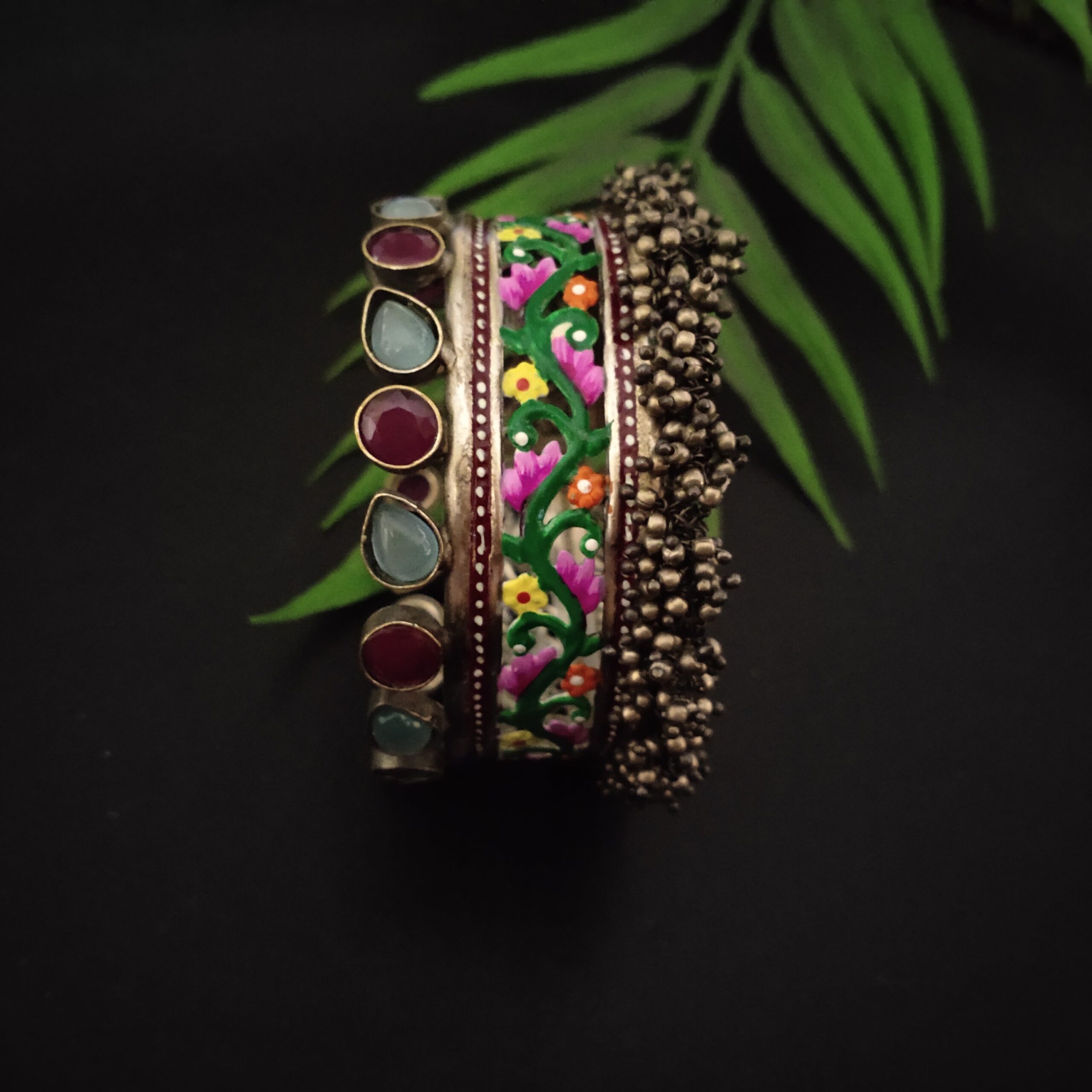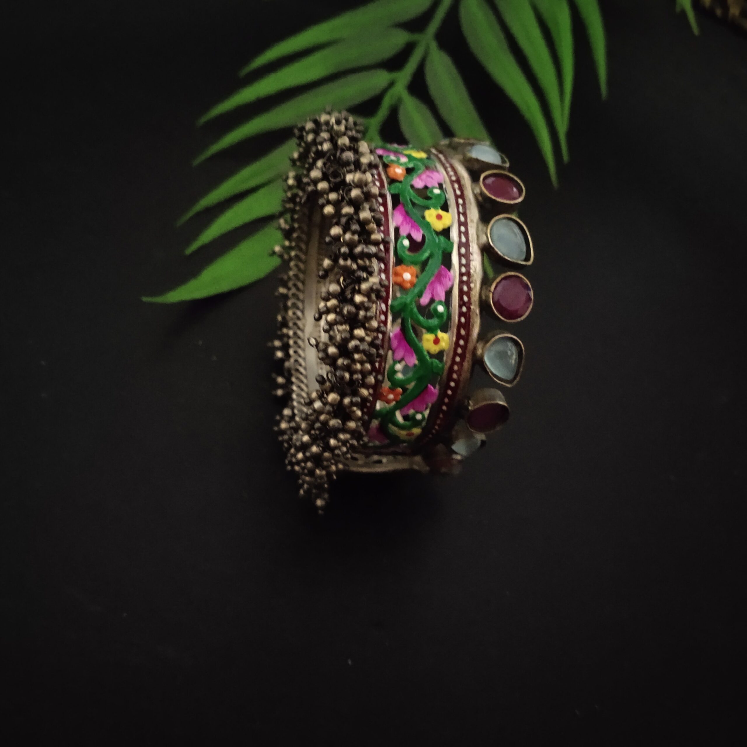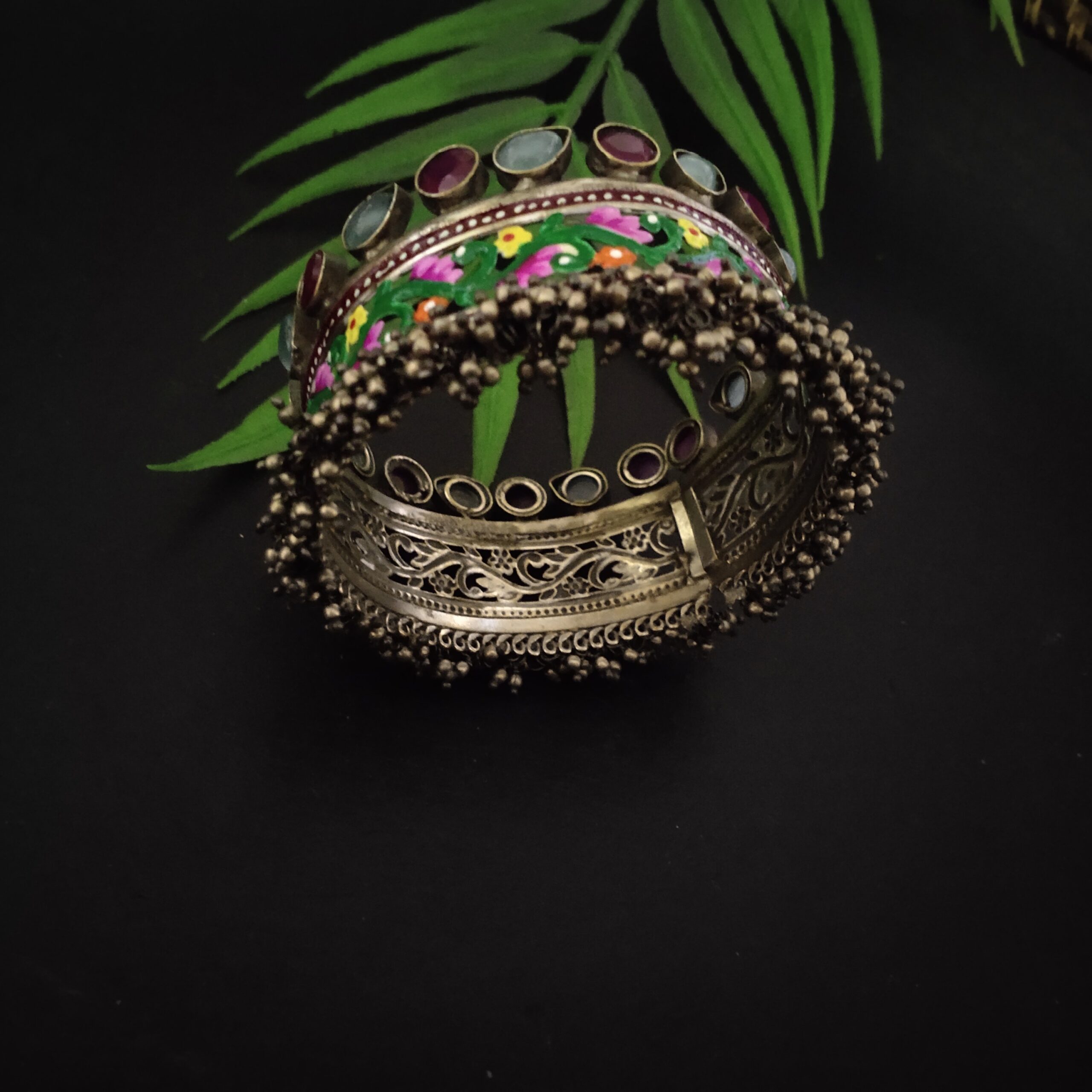 Silver plated brass round handpainted Kada clustered with ghunghroos and crystals