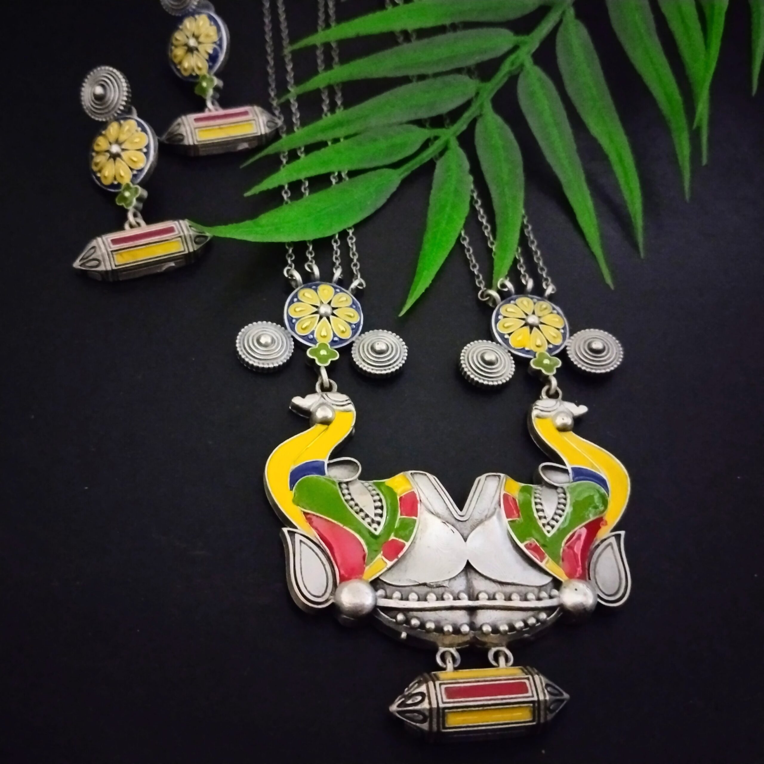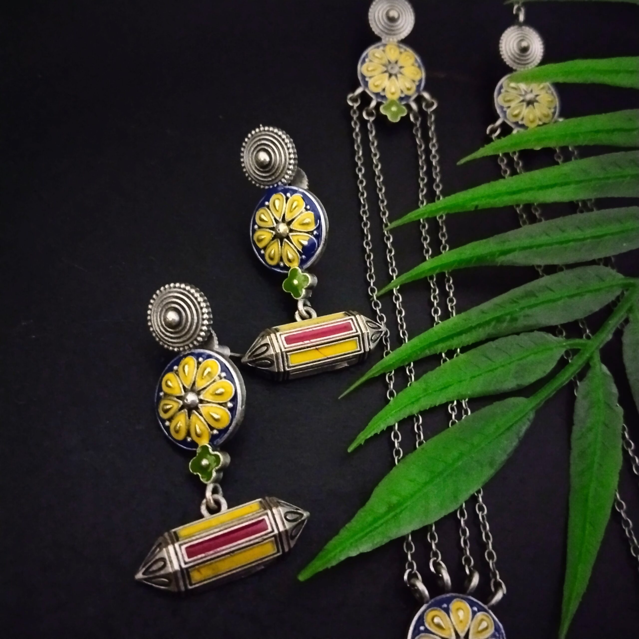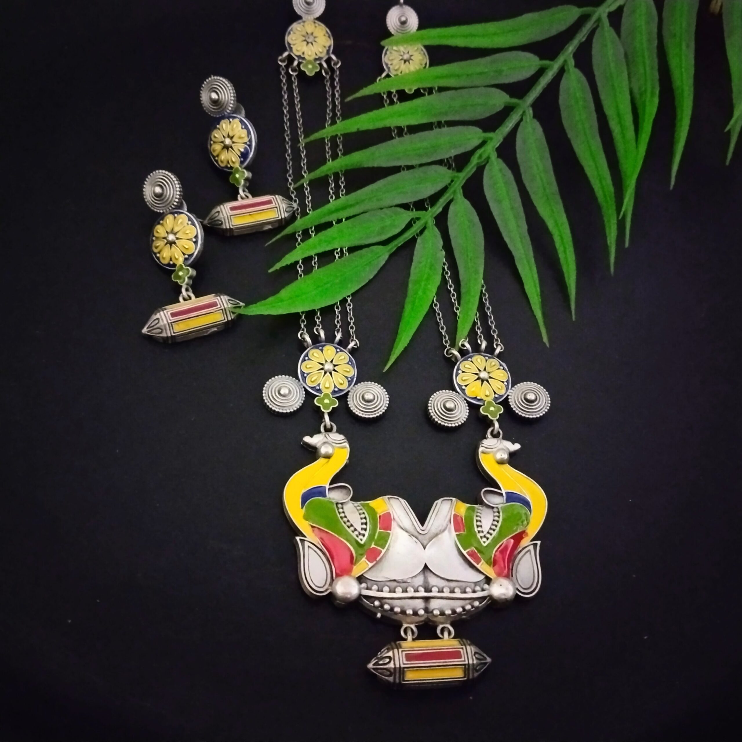 Dainty intricate detailed in silver plated brass with handpainted pendants and earrings is a versatile statement jewellery and conversation starter.