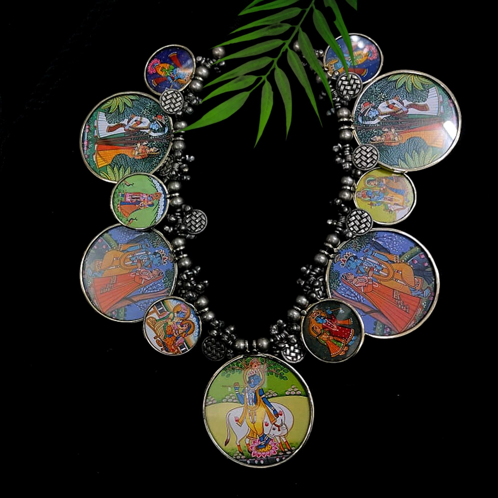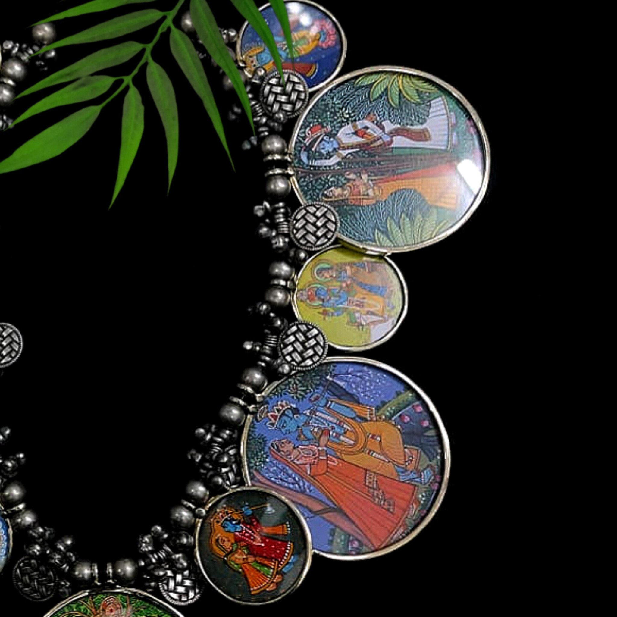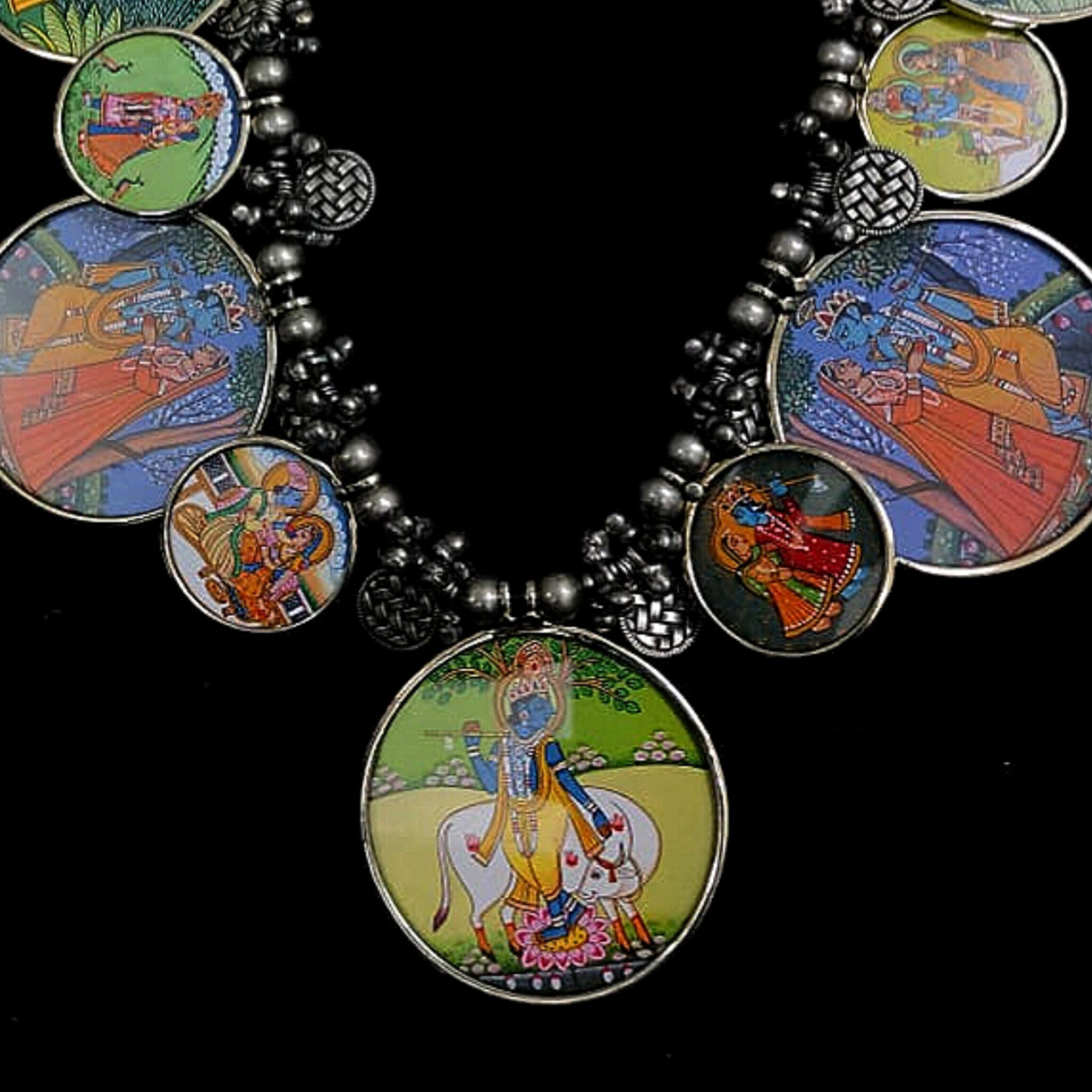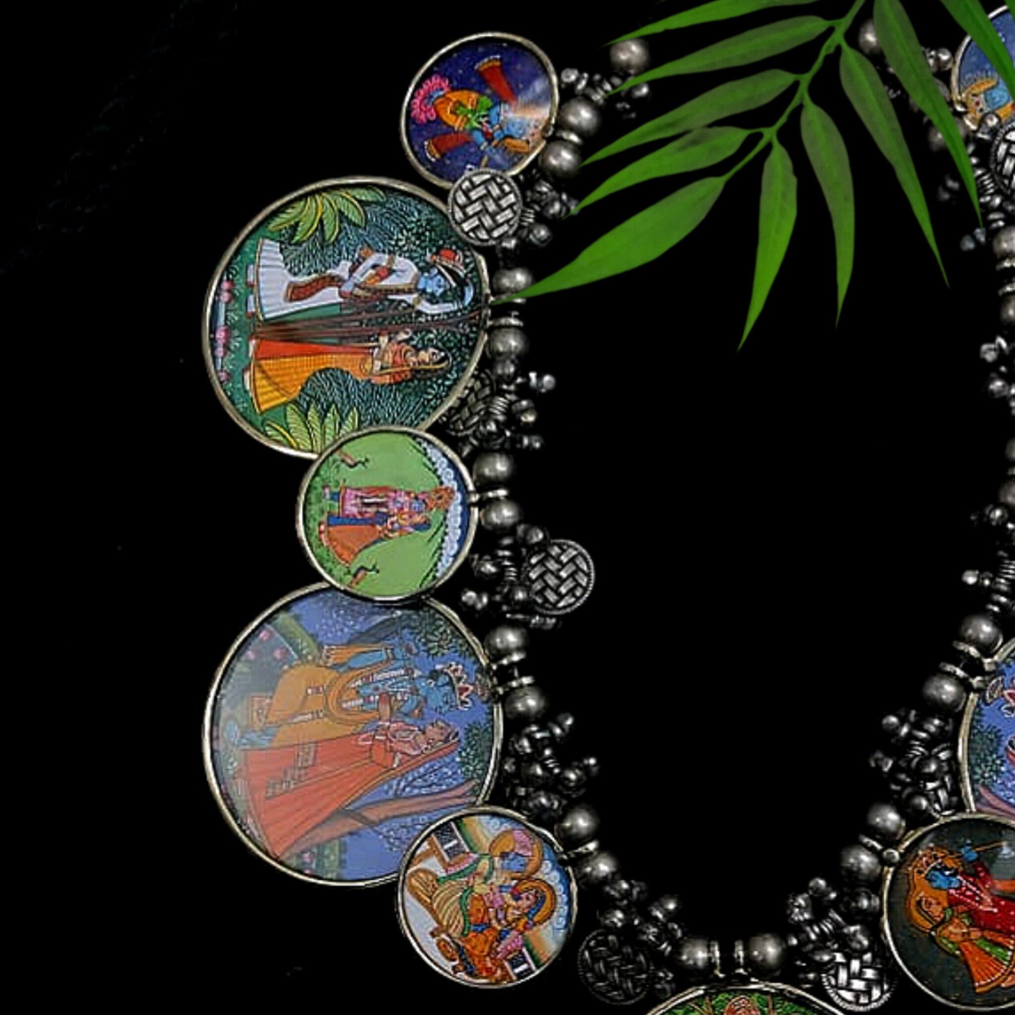 The magic that happens when silver plated brass come together with beautiful chitrakari handpainted pendant clustered with ghungroos fusion a stunning statement piece.