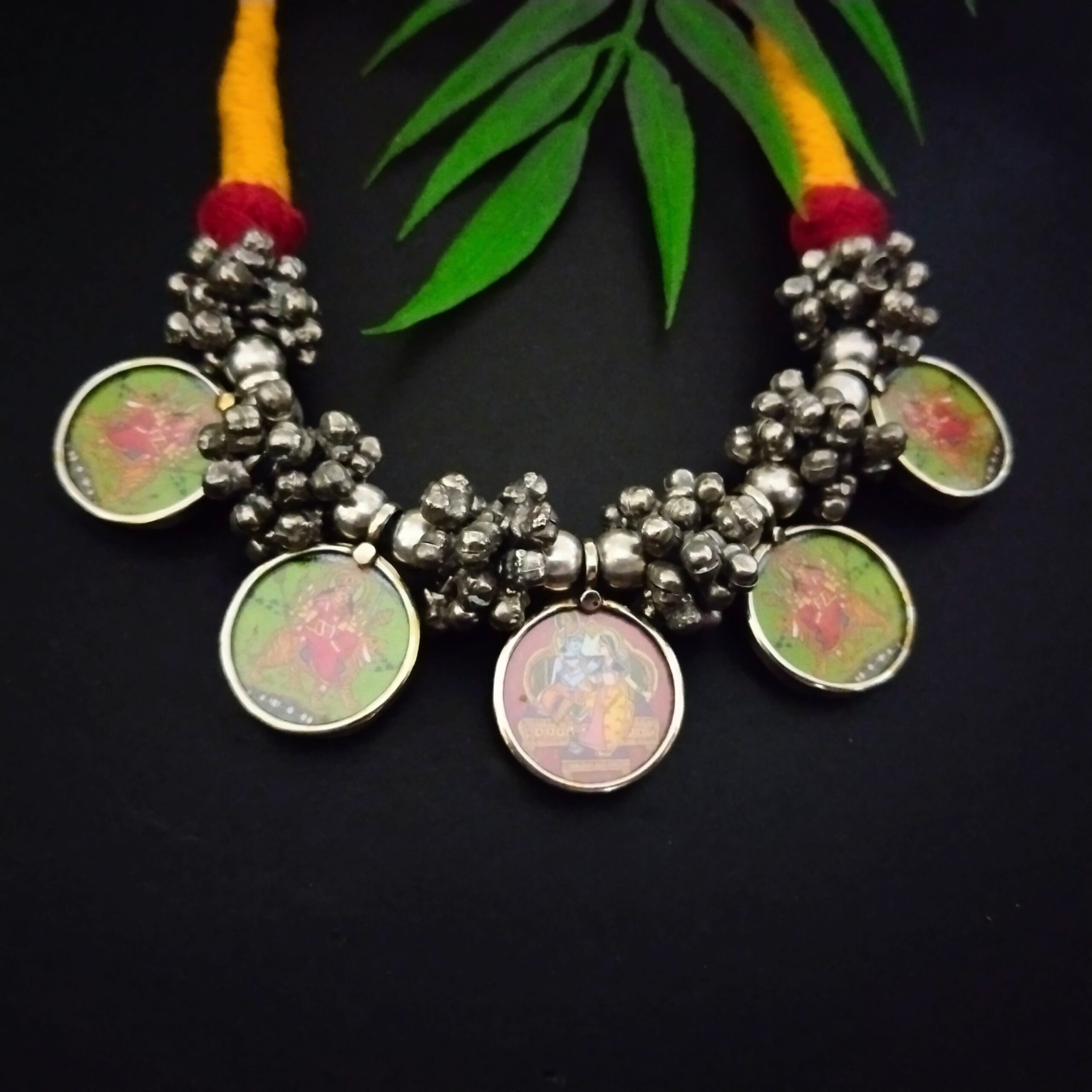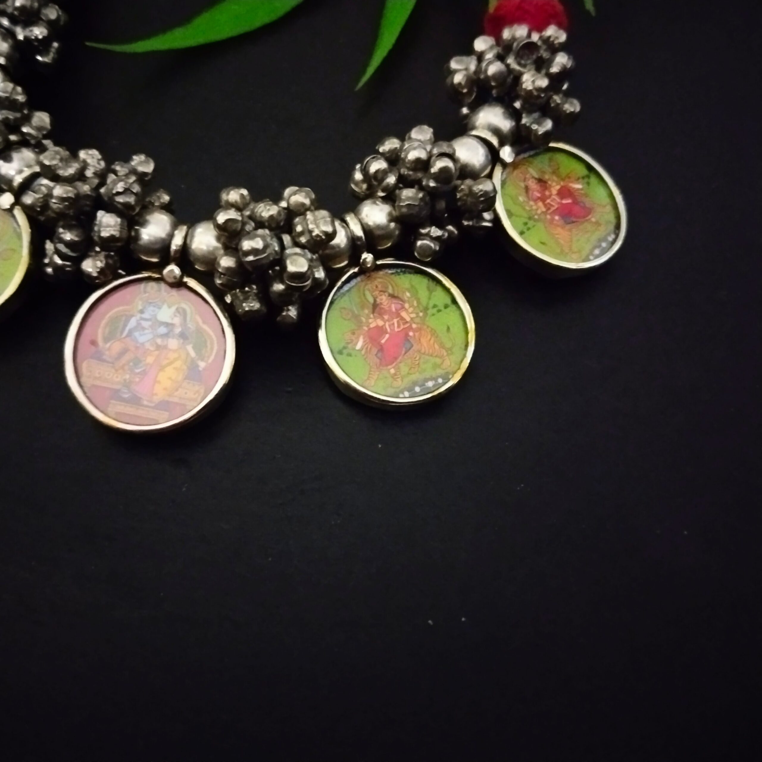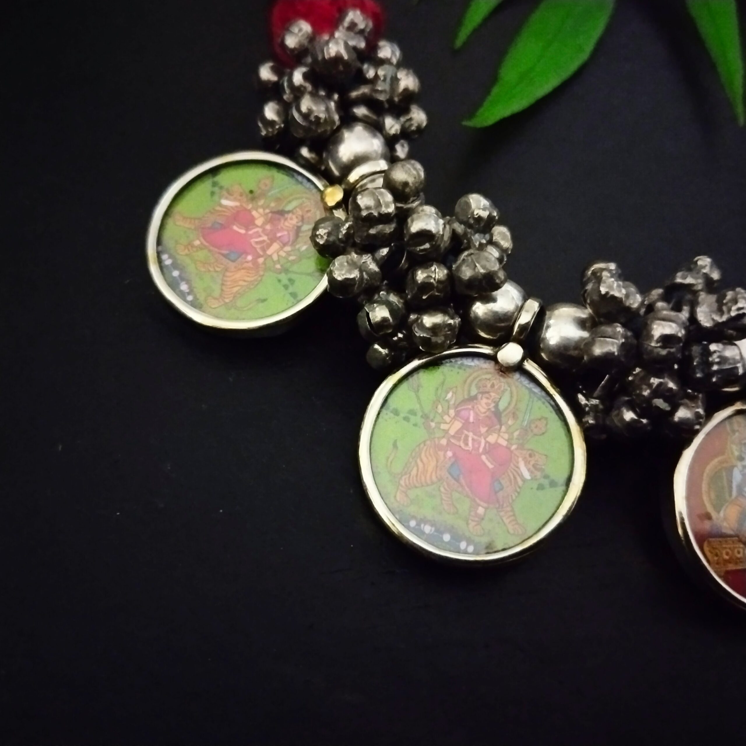 The magic that happens when silver plated brass come together with beautiful chitrakari handpainted pendant clustered with ghungroos fusion a stunning statement piece.