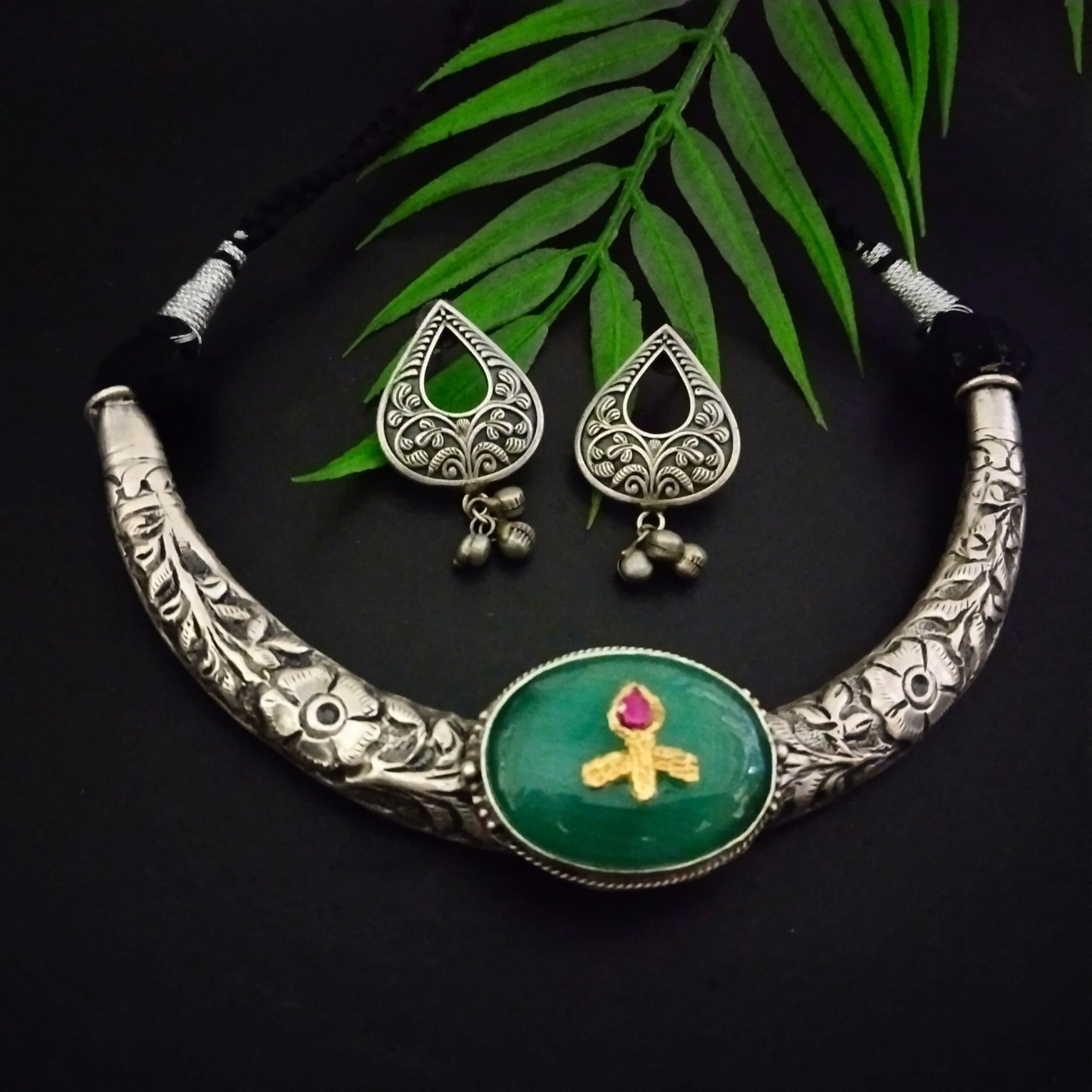 Beautiful and delicate silver plated brass pendant with inlay work on a chitai hasli and a drop stud clustered with ghungroo is a showstopper stunning statement piece.